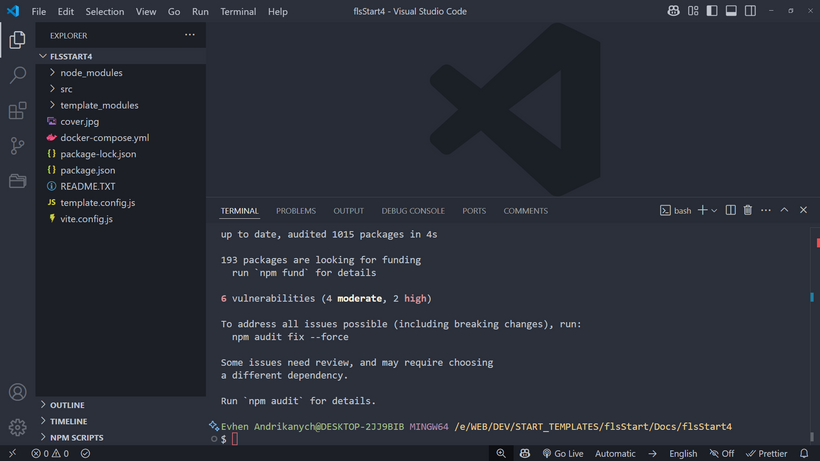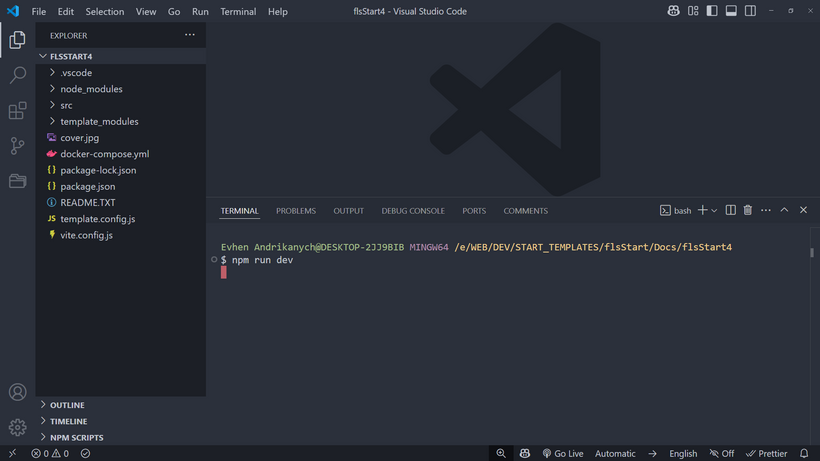 Итак, давайте запустим наш шаблон в режиме разработчика, для этого в терминале выполняем команду npm run dev